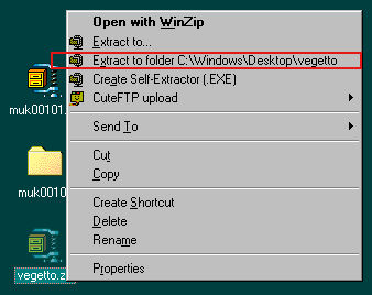 Step 3: Go to this page of my site: http://dragonbz.iwarp.com/mugen/index2.html and download Vegetto (save it to the desktop like before). Right click on vegetto.zip on your desktop and choose "extract to folder...". You should now have a folder called vegetto on your desktop. |