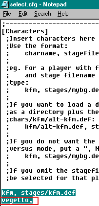 Step 6: At the very top you should see [Characters] (right). Scroll down until you see kfm, stages/kfm.def. Underneath that line, type vegetto, (yes, include the comma after vegetto) so it looks exactly like the image below. Go to FILE-->SAVE and close select.cfg. |
